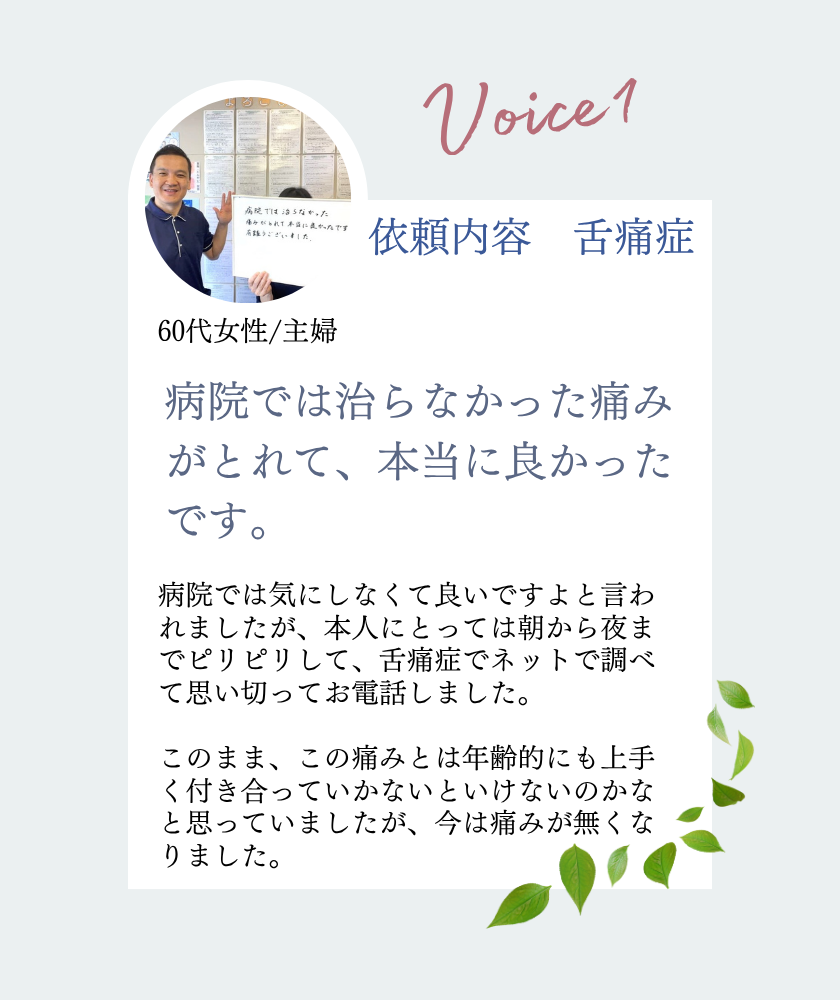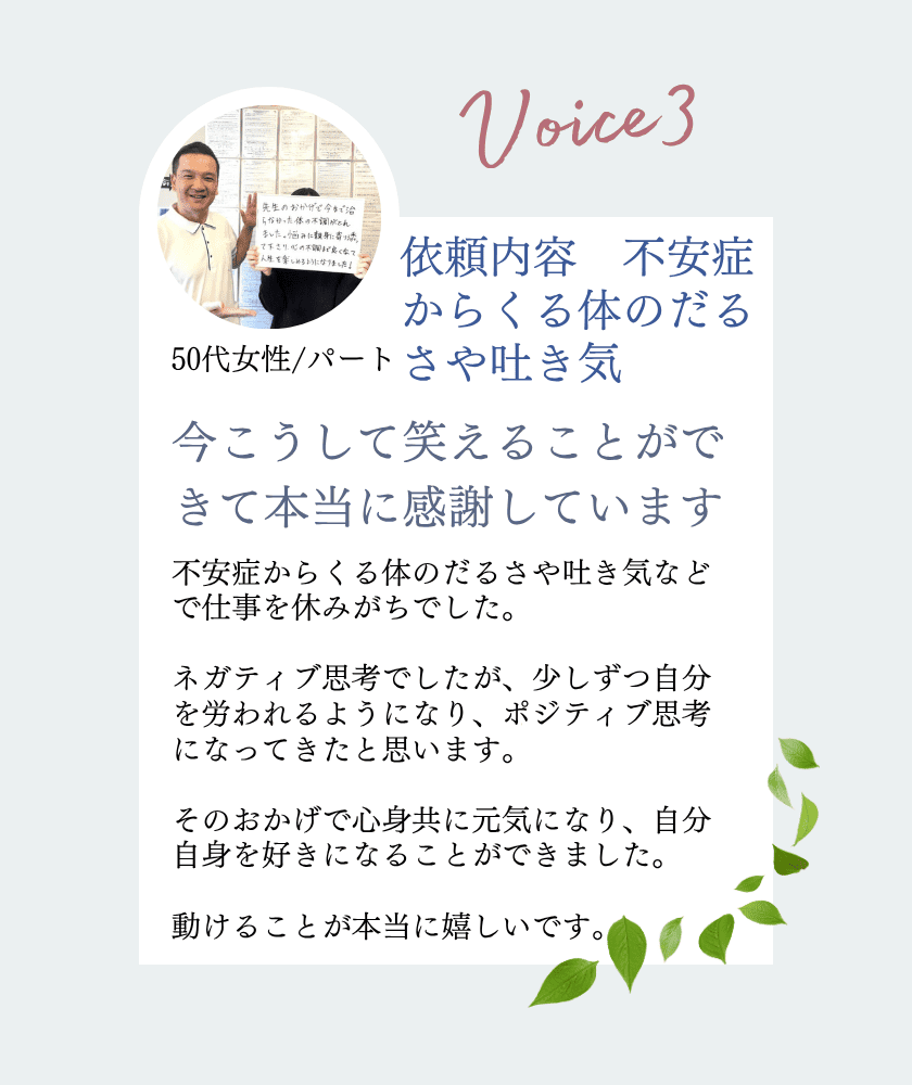 その2つの経験を持っているからこそ、来店された患者様が「どんな辛い思い」をしていて「解決したらどれだけ楽になるか」を【共感】して【安心感】を与えることができるのではないかと思います。