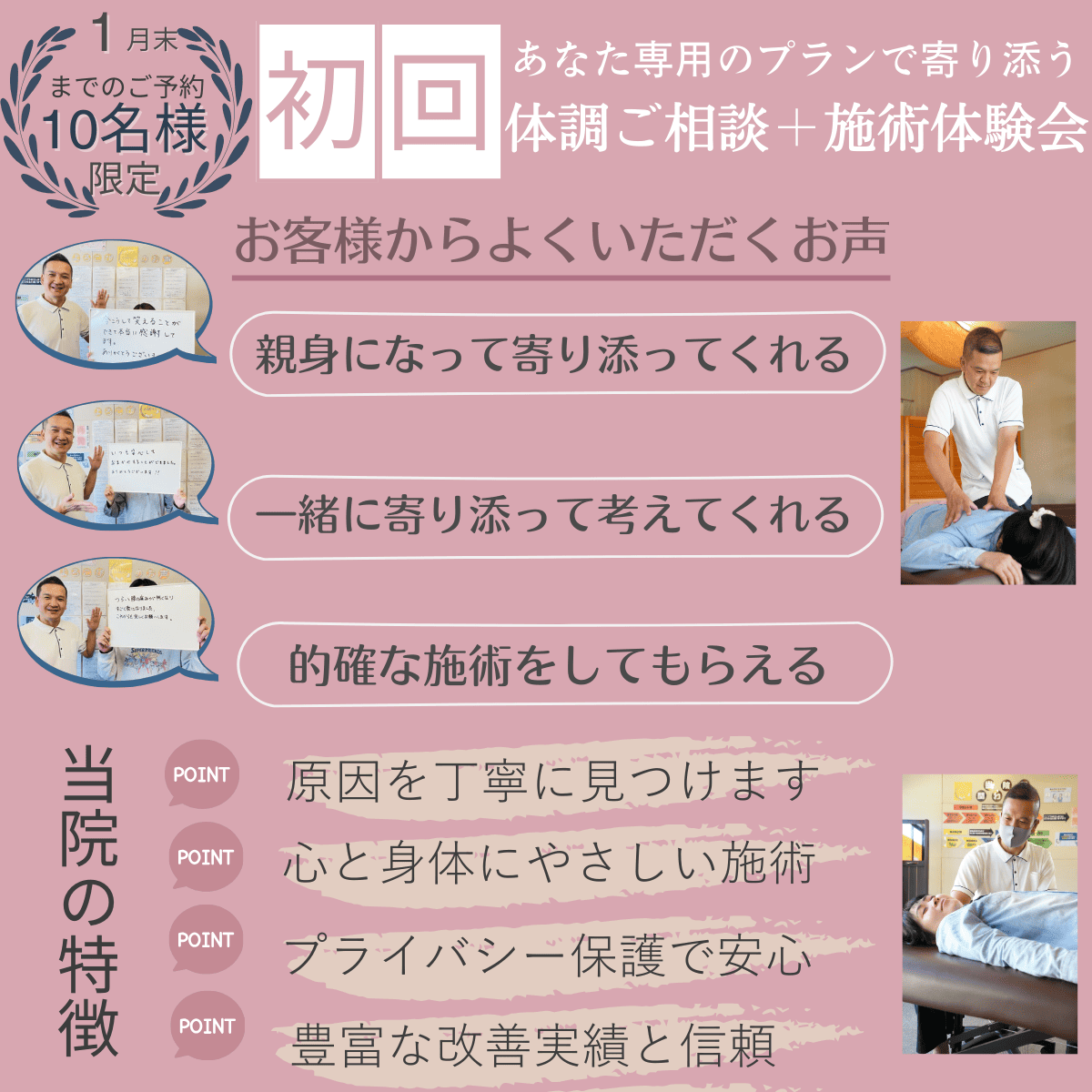 その中で、私自身が結果につなげられなかったプロセスも率直にお伝えすることで、「整体の先生ってこんなふうに考えているんだ」と知っていただき、あなたにとって最善な治療院に巡り合うきっかけになれば幸いです。