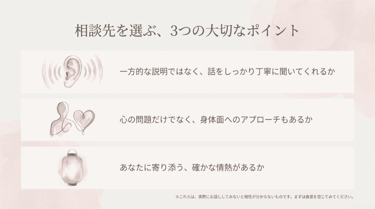 一方的に説明されるのではなく、あなたの状態を丁寧に理解しようとするかが重要です。