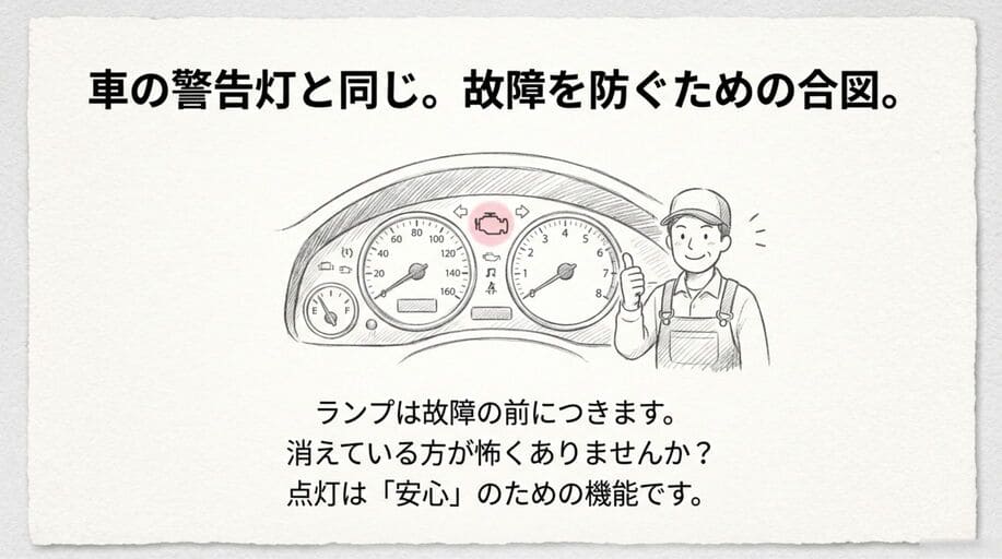 これらに共通することは、警告(警報・ランプ点灯)がある前提だからこそ、私たちは「安心」して暮らすことができます。