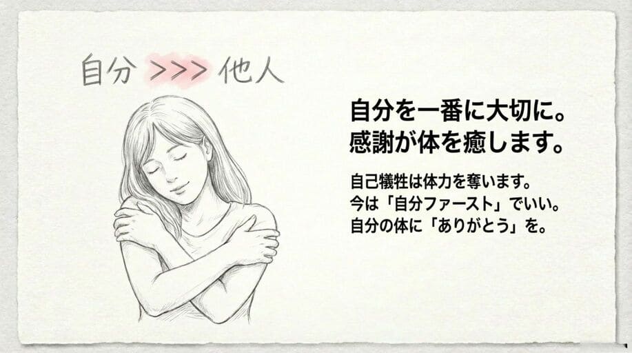 健康なら自己犠牲もいいと思いますが、体調が思わしくない時は自分ファーストでいきましょう。