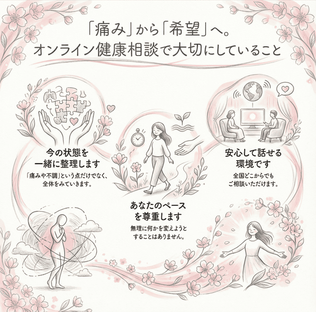 さかい快福整体堂のオンライン健康相談では、あなたの今の状態を丁寧に整理し、無理のないペースで整えていきます。