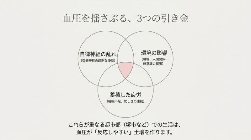 これらが重なりやすく、結果として血圧が反応しやすい状態になります。